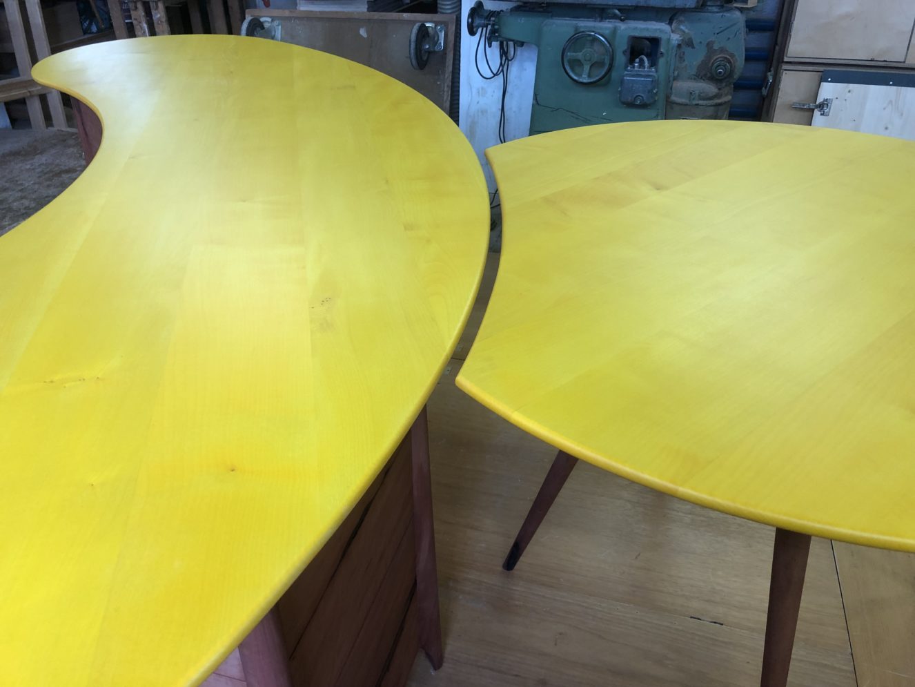 Bureau “Goldammer” Bureau cintré avec demi-lune satellite // Exécution érable teinté et poirier Année 2019 Bois Erable / Poirier