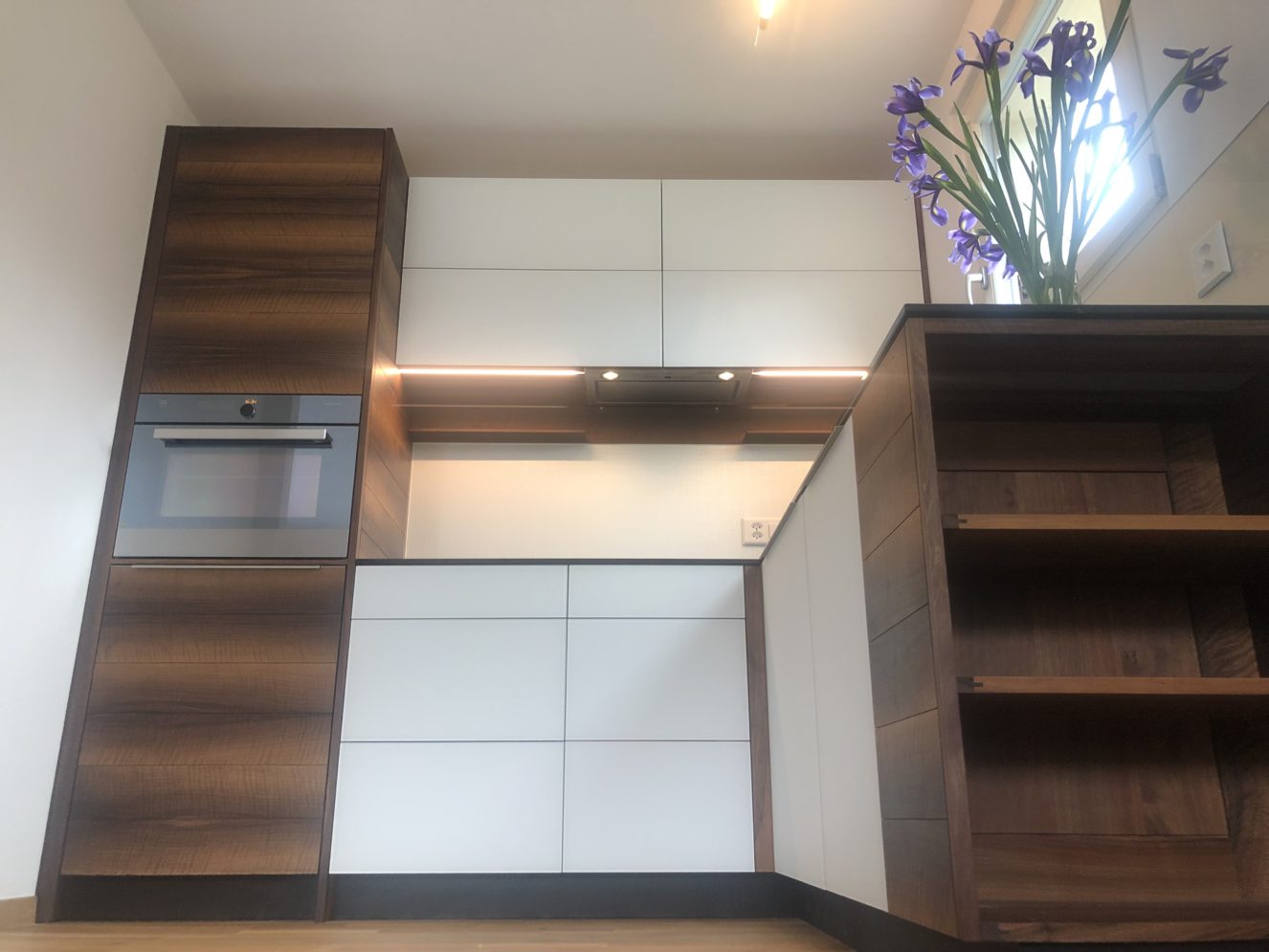 Cuisine “Noyer Ondé” Cuisine en verre satiné blanc et noyer ondé d’exception !! Année 2018 Bois Noyer